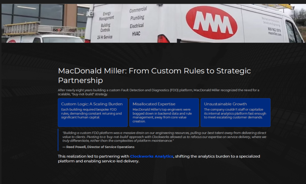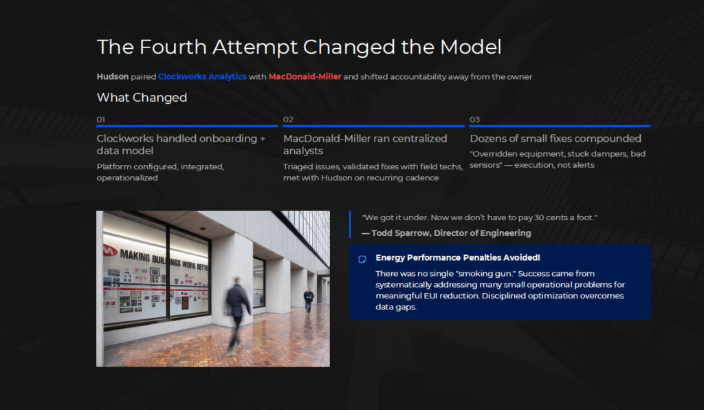 Read the case study below to learn how MacDonald-Miller helped Hudson Pacific Properties implement a service-led Fault Detection & Diagnostics (FDD) approach—moving beyond reactive alerts to drive consistent reliability, energy savings, and operational performance.
